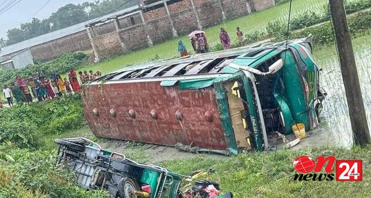 এসময় সড়কে চলতে থাকা ব্যাটারিচালিত একটি অটোরিকশার ধাক্কা লেগে যাত্রীবাহী বাস, অটোরিকশা ও পিকআপের ত্রিমুখী সংঘর্ষ হয়। এতে বাস ও অটোরিকশা সড়কের পাশে ধানক্ষেতে পড়ে যায় এবং পিকাপের সামনের অংশ সম্পুর্ন বিধ্বস্ত হয়।