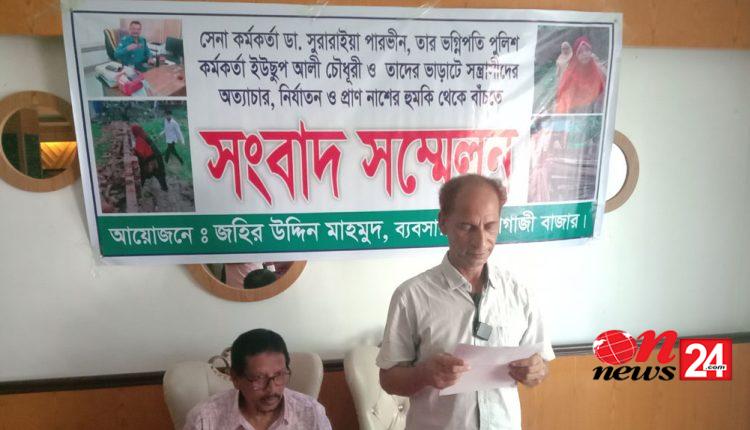 বুধবার দুপুরে ফেনী শহরের ক্রাউনওয়েস্ট রেস্টুরেন্টে তিনি জনাকীর্ণ এক সংবাদ সম্মেলনে তিনি অভিযোগ করেন ডা. সুরাইয়া পারভীন লে. কর্ণেল হিসেবে সেনাবাহিনীর সিএমইচএ এবং তার ভগ্নি পতি ইউছুপ আলী চৌধূরী ডিএমপির পল্টন থানার অধীনে গুলিস্তান আহাদ আলী পুলিশ বক্সের পরিদর্শক হিসেবে কর্মরত রয়েছেন। তিনি অভিযোগ করেন, দুই কর্মকর্তার নিকটাত্মীয় নাসির উদ্দিন হায়দার ও জসিম উদ্দিন হায়দারের স্ত্রী মাহফুজা আরজুর কাছ থেকে চলতি বছরের ১০মে সোনাগাজী পৌরসভার চচরচান্দিয়া মৌজায় সাড়ে দশ শতক জমি ক্রয় করে সীমানা প্রাচীর নির্মাণ করে ভোগ দখলে রয়েছেন। কিন্তু গত..ডা. সুরাইয়া পারভীনের নেতৃত্বে ৬-৭জনের একদল সশস্ত্র সন্ত্রাসী তার সীমানা প্রাচীর ভেঙে ফেলেন। তিনি বাধা দিলে তার ওপর হামলার চেষ্টা চালিয়ে হত্যার হুমকি দেন।