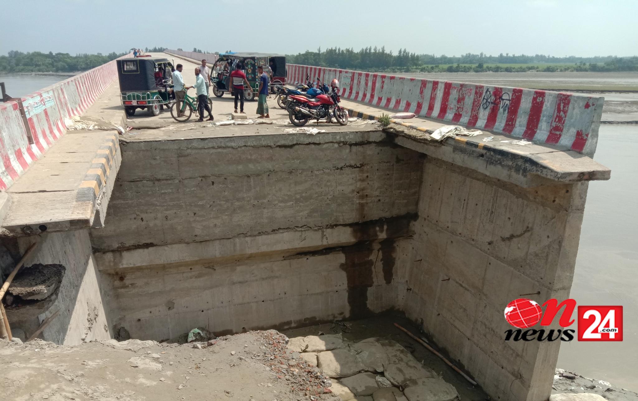 স্থানীয় বাসিন্দারা জানান, ভয়াবহ বন্যার পানির চাপে গত ২৫ আগস্ট পশ্চিম অংশে সেতুর নিচ থেকে দুই পাশের মাটি ও ব্লক সরে যায়। এরপর সেতুর সংযোগ সড়কেও ভাঙন দেখা দিতে শুরু করে। এ অবস্থায় স্থানীয় লোকজন স্বেচ্ছাশ্রমের ভিত্তিতে কয়েক হাজার বালুভর্তি বস্তা দিয়ে ভাঙন রোধের চেষ্টা করেন। কিন্তু তাও বন্যাপরবর্তী জোয়ারের পানিতে তলিয়ে যায়। সোমবার সরেজমিনে গিয়ে দেখা গেছে নোয়াখালী সড়ক ও জনপথ বিভাগের অধীনে শ্রমিকরা জিও ব্যাগে বালিভর্তি করছেন। শ্রমিক মো. শামিম জানান এর আগে স্থানীয় জননতা স্বেচ্ছাশ্রমে হাজার হাজার বস্তা বালি দিয়েও গর্তটি ভরাট করতে পারেনি। এবার জিও ব্যাগে বলি ভর্তি করে ভরাট করা হবে।
