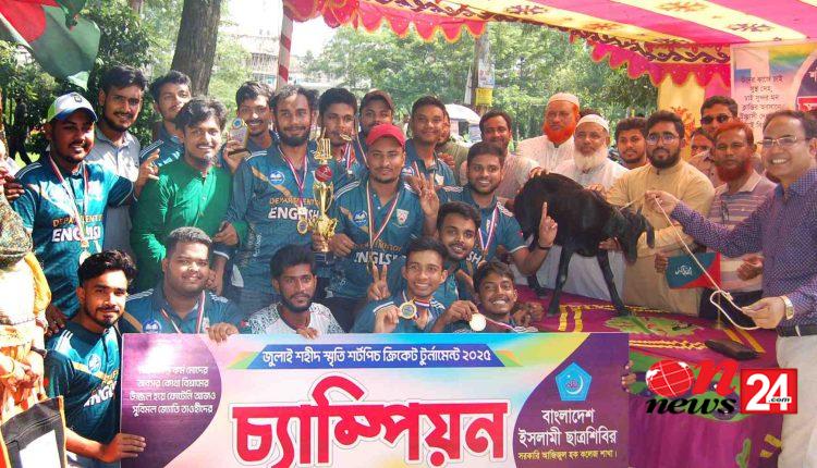 সোমবার দুপুরে বাংলাদেশ ইসলামী ছাত্রশিবির সরকারি আজিজুল হক কলেজ শাখার উদ্যোগে জুলাই শহীদ স্মৃতি শর্টপিচ ক্রিকেট টুর্নামেন্টের ফাইনাল খেলা অনুষ্ঠিত হয়। খেলায় রাস্ট্রবিজ্ঞান বিভাগ কে হারিয়ে ইংরেজী বিভাগ জয়লাভ করে। কলেজ ছাত্রশিবিরের সভাপতি আব্দুল্লাহ আল মামুনের সভাপতিত্বে ও সেক্রেটারি তামিম হাসান সাকিবের পরিচালনায় অনুষ্ঠানে প্রধান অতিথি ছিলেন সরকারি আজিজুল হক কলেজ ছাত্র সংসদের সাবেক ধর্মীয় ও সমাজকল্যাণ সম্পাদক এবং বগুড়া শহর জামায়াতের আমীর অধ্যক্ষ আবিদুর রহমান সোহেল। বিশেষ অতিথি হিসাবে উপস্থিত ছিলেন সরকারি আজিজুল হক কলেজ ছাত্রসংসদের সাবেক জিএস ও শহর জামায়াতের সেক্রেটারী আ.স.ম আব্দুল মালেক, বাংলাদেশ ইসলামী ছাত্রশিবির বগুড়া শহর শাখার সেক্রেটারি শফিকুল ইসলাম। এছাড়া উপস্থিত ছিলেন ইংরেজি বিভাগের প্রধান আকিদুল ইসলাম, প্রভাষক তানিয়া তাবাসসুম, প্রভাষক ফাহমিদা রোজানা ও রাষ্ট্রবিজ্ঞান বিভাগের প্রধান প্রফেসর মাসুদ ইকবাল, প্রভাষক সোহরাব হোসেন, শিক্ষক পরিষদের সাধারন সম্পাদক টিপু সুলতান, গণিত বিভাগের প্রধান রফিকুল ইসলাম প্রমুখ। ফাইনাল খেলা শেষে বিজয়ী দল ইংরেজি বিভাগকে ১টি খাসি ও ট্রফি এবং রানার্সআপ দল রাষ্ট্রবিজ্ঞান বিভাগকে ২টি রাজহাঁস ও ট্রফি প্রদান করা হয়। এছাড়া ৩য় স্থান অর্জনকারী দর্শন বিভাগকে ১টি রাজহাঁস প্রদান করা হয়। খেলায় ৬৯ রানের টার্গেট নিয়ে ব্যাট করতে নেমে ২ বল বাকি রেখেই ২ উইকেটে বিজয়ী হন ইংরেজি বিভাগ।