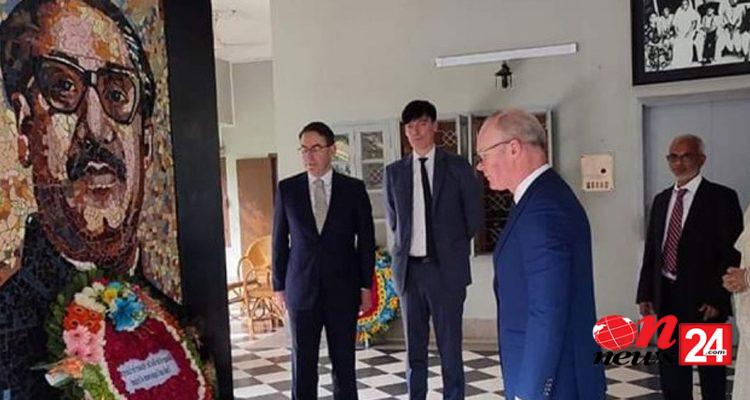 ঢাকা সফররত আয়ারল্যান্ডের এন্টারপ্রাইজ, বাণিজ্য ও কর্মসংস্থানমন্ত্রী সাইমন কোভেনি ধানমন্ডির ৩২ নাম্বারে জাতির পিতা বঙ্গবন্ধু শেখ মুজিবুর রহমানের প্রতিকৃতিতে শ্রদ্ধা জানিয়েছেন।