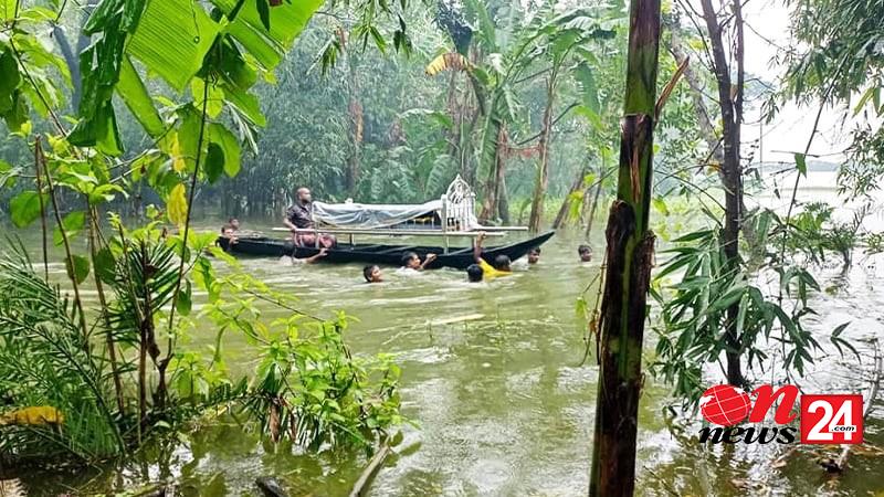 যশোরের কেশবপুরে বন্যার পানিতে গ্রামের রাস্তাঘাট তলিয়ে যাওয়ায় লাশ নৌকায় করে কবরস্থানে নিয়ে যেতে হয়েছে। পারিবারিক কবরস্থানে পানি থাকায় পাশের উঁচু জায়গায় দাফন করা হয়েছে লাশটি।