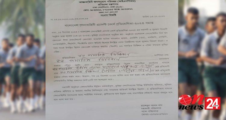 বাংলাদেশ সেনাবাহিনী এ্যাসল্ট কোর্স প্রতিযোগিতা ২০২৩ এর সমাপনী ও পুরস্কার বিতরণী অনুষ্ঠিত হয়েছে। অনুষ্ঠানে বাংলাদেশ সেনাবাহিনীর চিফ অব জেনারেল স্টাফ লেফটেন্যান্ট জেনারেল আতাউল হাকিম সারওয়ার হাসান প্রধান অতিথি হিসেবে উপস্থিত থেকে বিজয়ীদের মাঝে পুরস্কার বিতরণ করেন। এ সময় আরো উপস্থিত ছিলেন জেনারেল অফিসার কমান্ডিং ( জিওসি ) ৩৩ পদাতিক ডিভিশন ও এরিয়া কমান্ডার কুমিল্লা এরিয়া।