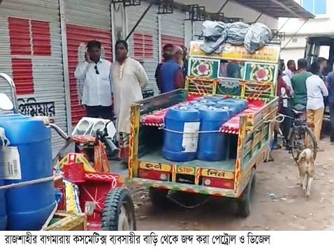 বাগমারায় কসমেটিক্স ব্যবসায়ীর বাড়ি থেকে বিপুল পরিমান মজুদ পেট্রোল উদ্ধার