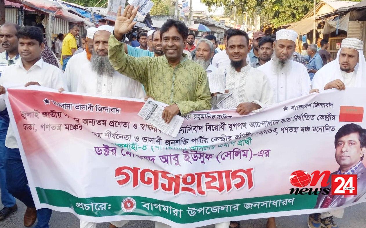 আগামী জাতীয় সংসদ নির্বাচনে রাজশাহী-৪, বাগমারা আসনে গণতন্ত্র মঞ্চের অন্যতম শীর্ষনেতা ও ভাসানী জনশক্তি পার্টির কেন্দ্রীয় কমিটির মহাসচিব ডক্টর মোহাম্মদ আবু ইউসুফ সেলিম দলীয় নেতা-কর্মীদের সঙ্গে নিয়ে প্রচার মিছিল, লিফলেট বিতরণ ও পথসভা করেছেন।