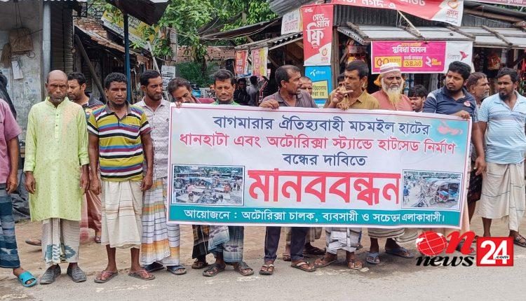 বাগমারা মচমইল হাটে হাটসেড নির্মাণ বন্ধের দাবিতে মানববন্ধন