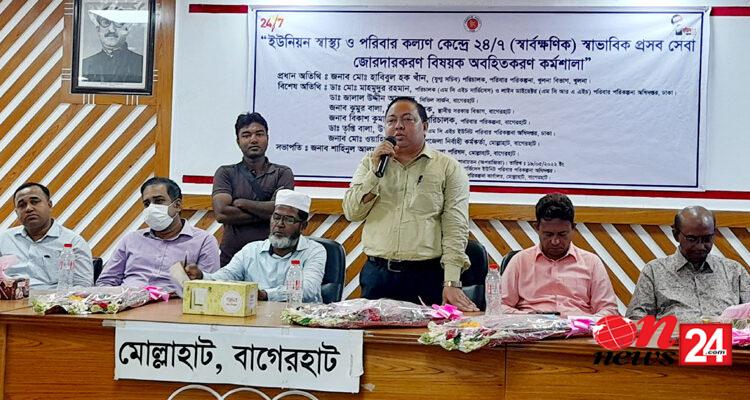 বাগেরহাটের মোল্লাহাটে গত বৃহস্পতিবার(১৯ মে) উপজেলা পরিষদ মিলনায়তনে, ইউনিয়ন স্বাস্থ্য ও পরিবার কল্যান কেন্দ্রে ২৪/৭(সার্বক্ষনিক) স্বাভাবিক প্রসব সেবা নিশ্চিত ও জোরদারকরণের লক্ষ্যে উপজেলা পর্যায়ে অবহিতকরণ কর্মশালা অনুষ্ঠিত হয়েছে। উপজেলা পরিবার পরিকল্পনা কার্যালয়ের আয়োজনে এবং পরিবার পরিকল্পনা অধিদপ্তরাধীন এমসিএইচ ইউনিটের উদ্যোগে অনুষ্ঠিত উক্ত কর্মশালায় প্রধান অতিথি ছিলেন খুলনাা বিভাগীয় পরিবার পরিকল্পনা পরিচালক (যুগ্ম-সচিব) হাবিবুল হক খান। সভাপতিত্ব করেন উপজেলা পরিষদ চেয়ারম্যান শাহীনুল আলম ছানা।