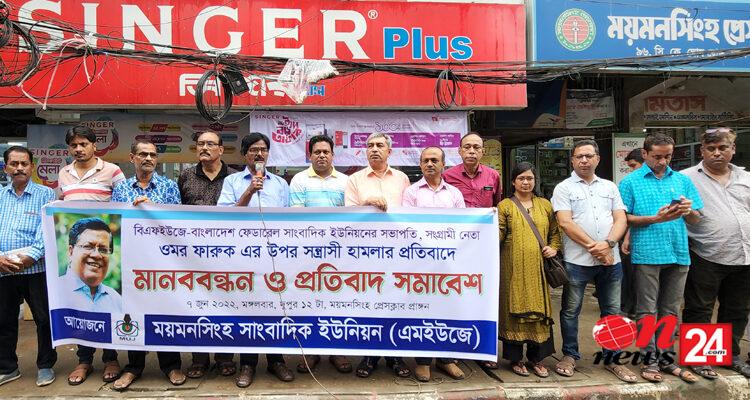 বাংলাদেশ ফেডারেল সাংবাদিক ইউনিয়ন (বিএফইউজে) সভাপতি ওমর ফারুকের ওপর সন্ত্রাসী হামলার প্রতিবাদে ময়মনসিংহে মানববন্ধন ও প্রতিবাদ সমাবেশ করেছে ময়মনসিংহ সাংবাদিক ইউনিয়ন-এমইউজে।