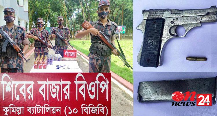 বিজিবি’র কুমিল্লা ব্যাটালিয়নের অভিযানে বিদেশী পিস্তল (ম্যাগাজিনসহ), গুলি, মদ এবং গাঁজা আটক