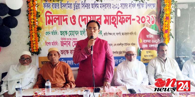 এতে প্রধান অতিথি হিসেবে বক্তব্য রাখেন জাতীয় শিক্ষক নেতা ও ফকিরবাজার ইসলামিয়া ছুন্নিয়া সিনিয়র আলিম মাদ্রাসার সভাপতি অধ্যক্ষ মোহাম্মদ আলী চৌধুরী মানিক। মাদ্রাসার অধ্যক্ষ মাও. কাজী আবুল বাসারের সভাপতিত্বে এবং প্রভাষক এম. সাইফুল ইসলামের সঞ্চালনায় বক্তব্য রাখেন সাবেক সভাপতি হাজী আ: ওহাব মাস্টার, সহকারি অধ্যাপক আ: খালেক, অত্র মাদ্রাসার গভর্ণিং বডির সদস্য হাজী তফাজ্জল হোসেন, অভিভাবক সদস্য কাজী বাহার মিয়া, দাতা সদস্য হাজী মনিরুল হক আরিফ, বীর মুক্তিযোদ্ধা কাজী আবুল কাশেম, খারেরা সরকারি প্রা: বিদ্যালয়ের সাবেক সভাপতি আবদুস ছালাম, বর্তমান সভাপতি এম. আবদুল কাইয়ুম, কাজী তাজুল ইসলাম।