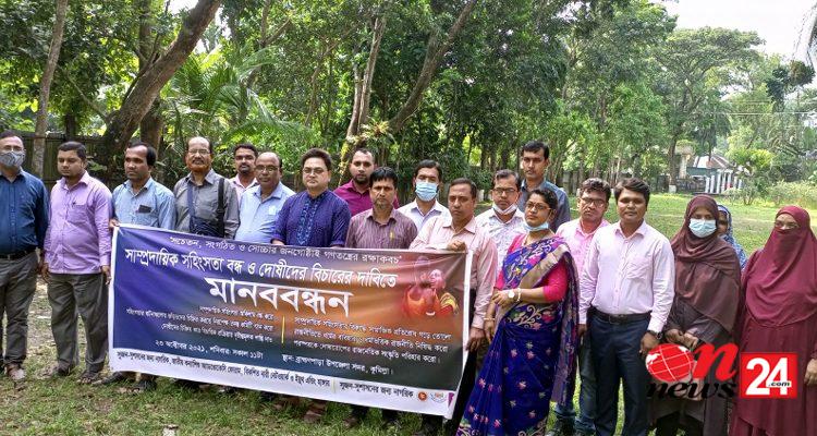 সারাদেশে হিন্দু ধর্মাবলম্বীদের উপর হামলা, তাদের বাড়িঘর ভাংচুর ও পূজামন্ডপে কোরআন রাখাকে কেন্দ্র করে সাম্প্রদায়িক সহিংসতার বিরুদ্ধে সারাদেশে একসাথে প্রতিবাদ সভা ও মানববন্ধন অনুষ্ঠিত হয়েছে। এরই অংশ হিসাবে কুমিল্লা জেলার ব্রাহ্মণপাড়া উপজেলা সদরে সুশাসনের জন্য নাগরিক (সুজন) এর আয়োজনে শনিবার সকাল ১১টায় মানববন্ধন ও প্রতিবাদ সভা অনুষ্ঠিত হয়েছে। সুজন এর উপজেলা শাখার সভাপতি সাংবাদিক সৈয়দ আহাম্মদ লাভলু’র সভাপতিত্বে উপস্থিত ছিলেন যুগ্ম সম্পাদক সহকারী অধ্যাপক গোলাম মোস্তফা, যুগ্ম সম্পাদক সহকারী অধ্যাপক আব্দুল কুদ্দুছ,সদস্য সাংবাদিক মোঃ বাছির উদ্দিন, আবদুল মতিন খসরু কলেজের ভারপ্রাপ্ত অধ্যক্ষ মোঃ জামাল হোসেন, সহকারী অধ্যাপক হুমায়ন কবির, প্রীতিলতা দাশ, প্রভাষক পারভীন আক্তার, বিশ্বজিৎ সাহা, সফিউল্ল্যাহ, এমরান আলী, প্রবাল কুমার দে, খালেকুর রহমান, সুমি রানী চক্রবর্তী, মজিবুর রহমান, ইমান হোসেন, অলিউল্ল্যাহ, নাজমুল হক, নাসরিন সুলতানা, ফখরুল ইসলাম, জান্নাত ফেরদৌনী খান চৌধুর। মানববন্ধন ও প্রতিবাদ সভায় শিক্ষক, সাংবাদিক ও এলাকার গন্যমান্য ব্যক্তিবর্গ উপস্থিত ছিলেন।