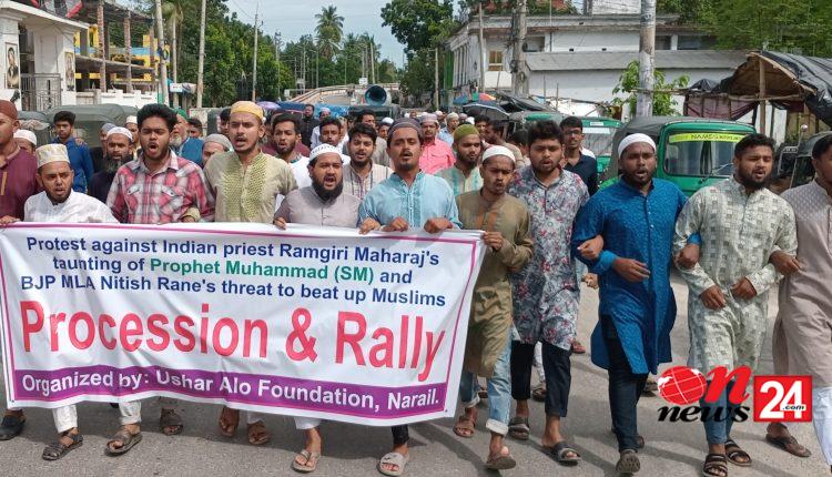 ভারতের বিতর্কিত ধর্মগুরু রামগিরি মহারাজ কর্তৃক মহানবী (সাঃ)-কে কটূক্তি ও বিজেপি বিধায়ক নিতীশ রানে কর্তৃক মুসলিমদের হুমকির প্রতিবাদে নড়াইলে বিক্ষোভ মিছিল করেছে ঊষার আলো ফাউন্ডেশন। শুক্রবার (২৭ সেপ্টেম্বর) বাদ জুমা পৌরসভার কেন্দ্রীয় জামে মসজিদ থেকে মিছিল নিয়ে পুরাতন বাস টার্মিনাল হয়ে হাসপাতালে মোড় ঘুরে পুনরায় বাস টার্মিনালে সমাবেশ করে বিক্ষোভকারীরা।