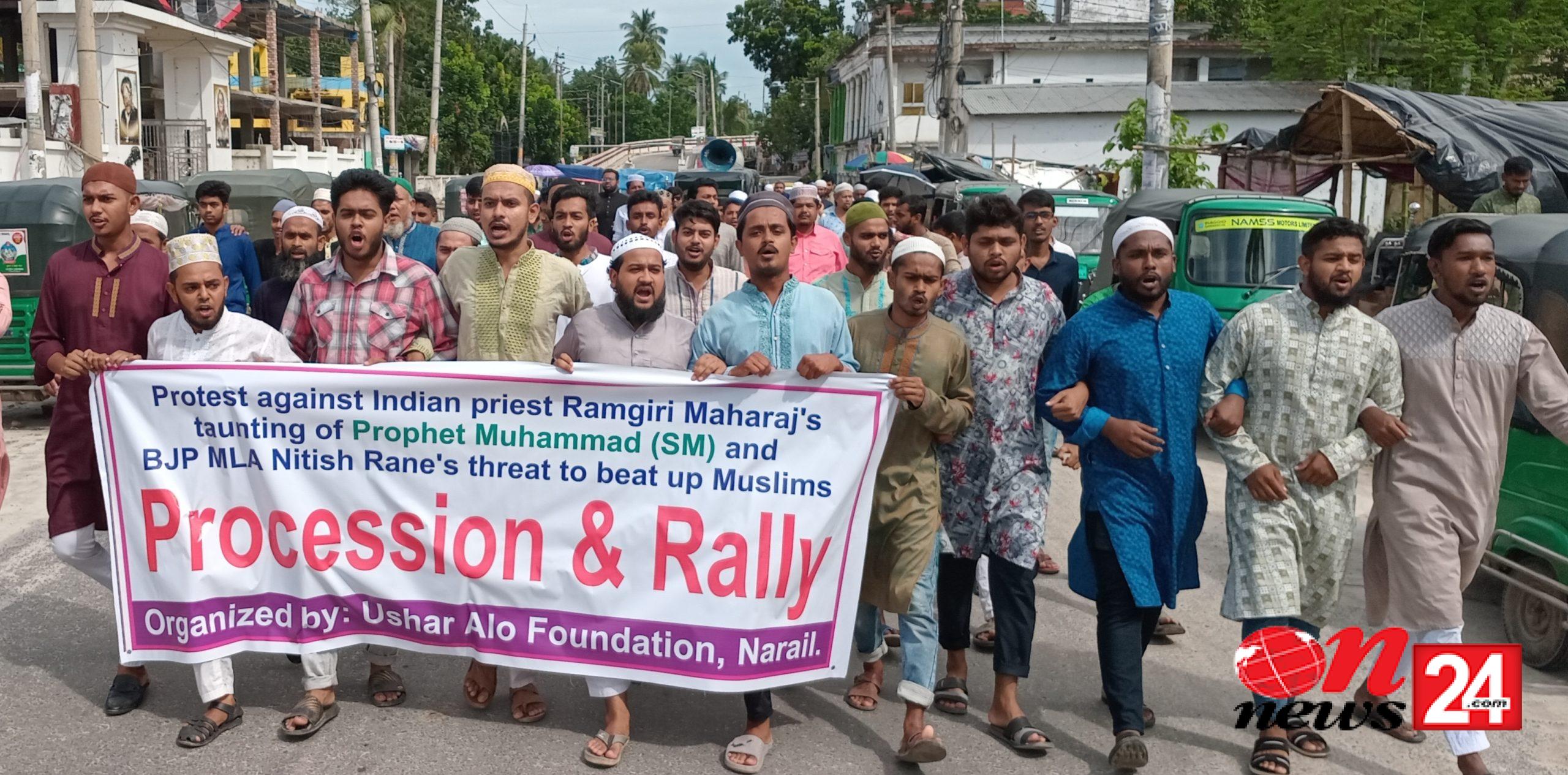 ভারতের বিতর্কিত ধর্মগুরু রামগিরি মহারাজ কর্তৃক মহানবী (সাঃ)-কে কটূক্তি ও বিজেপি বিধায়ক নিতীশ রানে কর্তৃক মুসলিমদের হুমকির প্রতিবাদে নড়াইলে বিক্ষোভ মিছিল করেছে ঊষার আলো ফাউন্ডেশন। শুক্রবার (২৭ সেপ্টেম্বর) বাদ জুমা পৌরসভার কেন্দ্রীয় জামে মসজিদ থেকে মিছিল নিয়ে পুরাতন বাস টার্মিনাল হয়ে হাসপাতালে মোড় ঘুরে পুনরায় বাস টার্মিনালে সমাবেশ করে বিক্ষোভকারীরা।