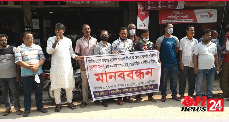 জাতীয় ভোক্তা অধিকার সংরক্ষণ অধিদপ্তর ঝিনাইদহের সহকারি পরিচালকের স্বেচ্ছাচারিতা, ক্ষমতার অপব্যহার ও দুর্নীতির বিচারের দাবিতে মানববন্ধনসহ সংবাদ সম্মেলন করেছেন ঝিনাইদহের ব্যবসায়ী সমাজ। শনিবার (২৩ অক্টোবর) দুপুরে ঝিনাইদহ জেলা প্রেসক্লাবে সংবাদ সম্মেলন ও জেলা শহরে মানববন্ধন কর্মসুচী পালন করেন ব্যবসায়ীরা ।
