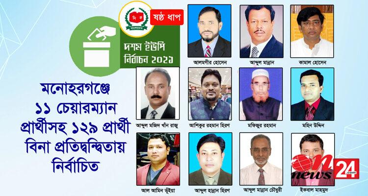 ষষ্ঠ ধাপের ইউনিয়ন পরিষদ নির্বাচনে কুমিল্লার মনোহরগঞ্জে ১১ চেয়ারম্যান প্রার্থীসহ ১২৯ প্রার্থী বিনা প্রতিদ্বন্দ্বিতায় নির্বাচিত হয়েছেন। বৃহস্পতিবার (১৩ জানুয়ারি) প্রার্থিতা প্রত্যাহারের শেষ দিন উপজেলার ১১ ইউনিয়নে চেয়ারম্যান পদে একক প্রার্থী হওয়ায় ১১ জন বিনা প্রতিদ্বন্দ্বিতায় চেয়ারম্যান নির্বাচিত হন। এছাড়াও সাধারণ মেম্বার ও সংরক্ষিত মহিলা মেম্বার পদে আরো ১১৮ জন বিনা প্রতিদ্বন্দ্বিতায় নির্বাচিত হয়েছেন।