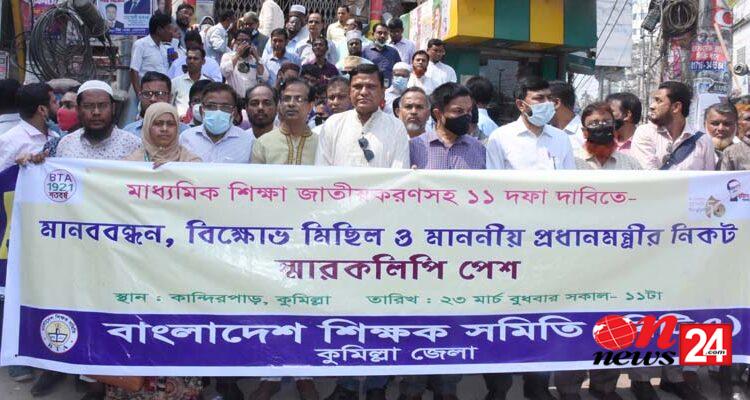 মাধ্যমিক শিক্ষাকে জাতীয় করণসহ ১১ দফাদাবিতে কুমিল্লায় শিক্ষকরা মানববন্ধন ও বিক্ষোভ মিছিলের কর্মসূচী পালন করেছে। গতকাল বুধবার সকাল ১০ টায় কুমিল্লা নগরীর কান্দিরপাড় এলাকায় বাংলাদেশ শিক্ষক সমিতি কুমিল্লা জেলা শাখার উদ্যোগে আয়োজিত ওই কর্মসূচীতে জেলার বিভিন্ন উপজেলার শিক্ষাপ্রতিষ্ঠানের সহস্রাধিক শিক্ষক অংশ গ্রহণ করেন।