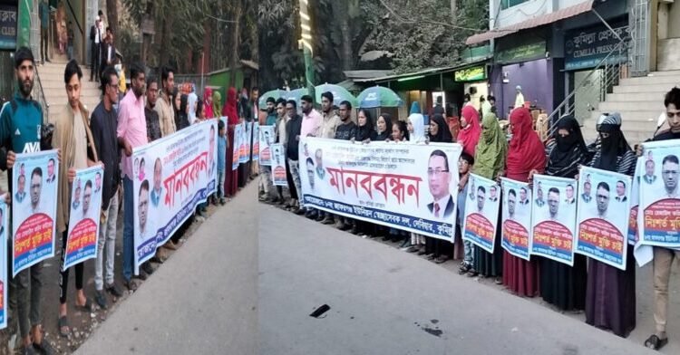 মিথ্যা মামলায় গ্রেফতারের প্রতিবাদে কুমিল্লায় মানববন্ধন