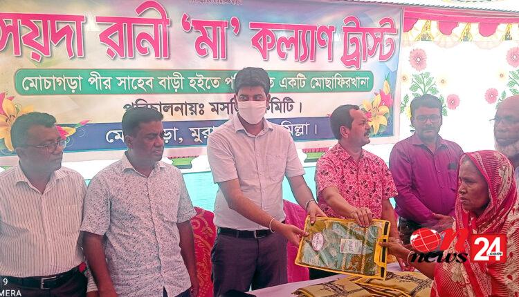 পবিত্র ঈদ-উল ফিতর উপলক্ষে আমেরিকা প্রবাসী কলম্বিয়া ইসলামিক বিশ^বিদ্যালয়ের অধ্যাপিকা সৈয়দা সুফিয়া আক্তারের অর্থায়নে ৪শ’ দরিদ্র পরিবারের মাঝে শাড়ী, লুঙ্গী ও গরুর গোশত বিতরণ করেছেন সৈয়দা রানী মা কল্যাণ ট্রাস্ট। গতকাল বিকেলে কুমিল্লার মুরাদনগর উপজেলার মোচাগড়া গ্রামের ওই অনুষ্ঠানে প্রধান অতিথির বক্তব্য রাখেন, উপজেলা নির্বাহী কর্মকর্তা অভিষেক দাশ। বিশেষ অতিথি ছিলেন, উপজেলা সমাজ সেবা কর্মকর্তা কবির আহামেদ।