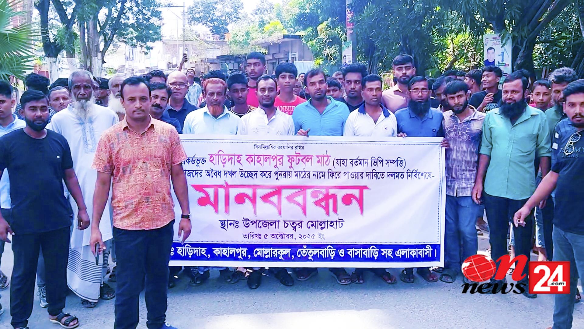 মোল্লাহাটের খেলার মাঠ দখলমুক্ত করতে এলাকাবাসীর বিক্ষোভ ও মানববন্ধন।