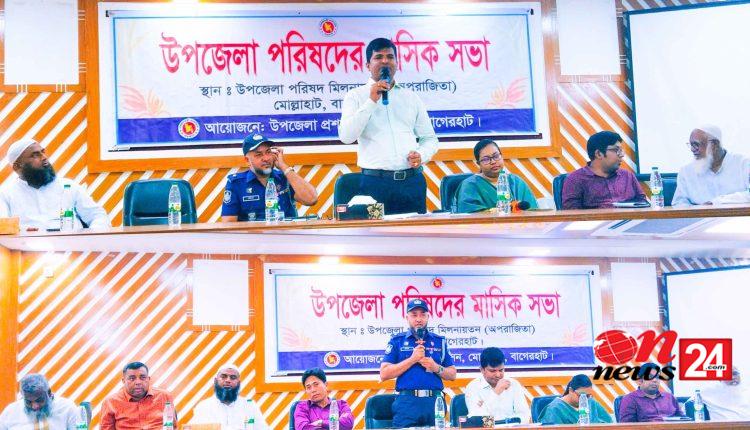 বাগেরহাটের মোল্লাহাট উপজেলা প্রশাসনের আয়োজনে মঙ্গলবার (২০ মে) সকালে উপজেলা পরিষদ মিলনায়তনে, উপজেলা আইন-শৃঙ্খলা কমিটির সভা অনুষ্ঠিত হয়েছে। একই সাথে উপজেলা সমন্বয় কমিটির সভা, সন্ত্রাস ও নাশকতা প্রতিরোধ কমিটির সভা, নারী নির্যাতন ও বাল্যবিবাহ প্রতিরোধ কমিটির সভাসহ আরো কয়েকটা কমিটির সভা অনুষ্ঠিত হয়। সভায় মোল্লাহাট উপজেলার আইন শৃঙ্খলার সার্বিক পরিস্থিতি নিয়ে বিস্তারিত আলোচনা করা হয় এবং  আসন্ন পবিত্র ঈদুল আযহা কে সামনে রেখে এ উপজেলার আইন শৃঙ্খলা পরিস্থিতি আরো সুন্দর ও স্বাভাবিক রাখার প্রত্যয় ব্যক্ত করেন কমিটির সদস্যগণ। সভায় সভাপতিত্ব করেন উপজেলা নির্বাহী অফিসার হরেকৃষ্ণ অধিকারী। অন্যান্য অতিথিদের মাঝে উপস্থিত ছিলেন ও বক্তব্য দেন সহকারী কমিশনার (ভূমি) তাহমিনা সুলতানা নীলা, থানা অফিসার ইনচার্জ মোঃ শফিকুল ইসলাম, উপজেলা কৃষি কর্মকর্তা অনিমেষ বালা, স্বাস্থ্য ও পরিবার পরিকল্পনা কর্মকর্তা ডাঃ তেন  মং, প্রাণিসম্পদ কর্মকর্তা ডাঃ মোঃ হাসান আলী, পল্লী বিদ্যুৎ ডিজিএম বিশুদ্ধানন্দ, উপজেলা বিএনপির আহবায়ক শিকদার জামাল উদ্দিন, যুগ্ম আহবায়ক, শেখ শাহেদ আলী, সদস্য সচিব মোঃ জাহিদুল ইসলাম মিয়া, জেলা যুবদলের সাবেক সভাপতি মোঃ হারুন আল রশিদ, জামায়াতের যুব শাখার সাধারণ সম্পাদক মোঃ পারভেজ  আলম, মোল্লাহাট প্রেস ক্লাবের সাধারণ সম্পাদক মোহাম্মাদ আলী মোহন, সাংগঠনিক সম্পাদক মোঃ শরিফুল ইসলাম, সাংস্কৃতি বিষয়ক সম্পাদক মোঃ কবির হোসেন সহ বিভিন্ন দপ্তরের কর্মকর্তা, জনপ্রতিনিধি, শিক্ষক প্রতিনিধি প্রমুখ।