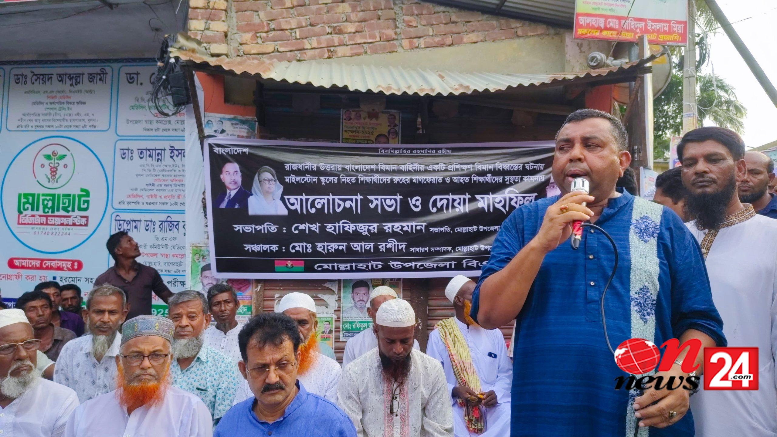 বাগেরহাটের মোল্লাহাটে রাজধানীর উত্তরায় বাংলাদেশ বিমান বাহিনীর একটি প্রশিক্ষণ বিমান বিধ্বস্তের ঘটনায় মাইলস্টোন স্কুল এন্ড কলেজের নিহত শিক্ষার্থীদের রুহের মাগফিরাত ও আহত শিক্ষার্থীদের সুস্থতা কামনায় আলোচনা সভা ও দোয়া মাহফিল অনুষ্ঠিত হয়েছে।