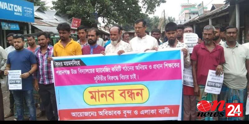 ময়মনসিংহ সদর উপজেলা পরানগঞ্জ উচ্চ বিদ্যালয়ের ম্যানেজিং কমিটি গঠনে অনিয়ম ও প্রধান শিক্ষকের দূর্নীতি র বিরুদ্ধে বিচার চেয়ে মানববন্ধন অনুষ্ঠিত হয়েছে। ২৯ সেপ্টেম্বর বৃহস্পতিবার দুপুর ১২ টায় বিদ্যালয়ের সামনে ঘন্টা ব্যাপী এ মানববন্ধন কর্মসূচি পালন করে সাবেক শিক্ষার্থী, অভিভাবক ও স্থানীয় এলাকাবাসী। এ সময়ে বক্তব্য রাখেন পরানগঞ্জ ইউনিয়ন আওয়ামী লীগের সহ সভাপতি আলহাজ্ব শাহজাহান সরকার বাচ্চু,বোররচর ইউনিয়ন জাতীয় পার্টির সভাপতি ও জেলা মুক্তিযোদ্ধা সম্পাদক মোঃ তফাজ্জল হোসেন,৩ নং ওয়ার্ড সাবেক ইউপি সদস্য মোঃ আব্দুস সোবহান, অভিভাবক সদস্য ও আওয়ামী লীগের নেতা মোঃ আকবর আলী,পরানগঞ্জ বাজার পল্লী চিকিৎসক ডাঃ আরিফ রব্বানী, সাবেক শিক্ষার্থী মোঃ মিরাজ আলী প্রমূখ।