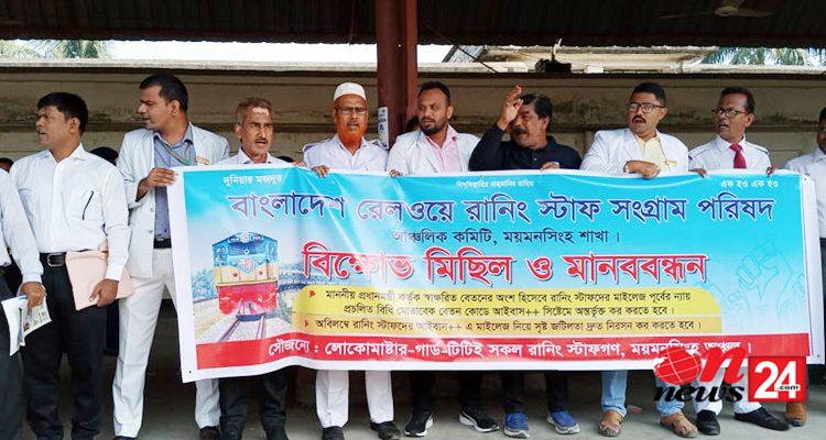 বৃহষ্পতিবার (৪ নভেম্বর) সকালে রেল স্টেশনের প্ল্যাটফর্মে বাংলাদেশ রেলওয়ে রানিং স্টাফ সংগ্রাম পরিষদ ময়মনসিংহ আঞ্চলিক উপকমিটির আয়োজনে ঘন্টাব্যাপী এই কর্মসূচী পালিত হয়। ২৪ ঘন্টার মধ্যে দাবী না মানা হলে ভবিষ্যতে কঠোর আন্দোলনের হুশিয়ারি প্রদান করা হয়। বক্তারা বলেন রেলওয়ে রানিং স্টাফ ট্রেন চালক,গার্ড ও টিটিই ট্রেন অপারেশনের সাথে সরাসরি সম্পৃক্ত,রেলওয়ে প্রচলিত বিধি মোতাবেক বেতনের অংশ হিসেবে মাইলেজ ভাতা পেয়ে আসছেন। কিন্তু গত বুধবারে সিনিয়র সহকারী সচিব শামীম বানু শান্তি স্বাক্ষরিত একটি প্রজ্ঞাপনে রানিং স্টাফদের সুবিধাদির প্রাপ্যতা বিষয়ে অর্থ বিভাগ একটি প্রজ্ঞাপন জারি করেছে। এই প্রজ্ঞাপন বাস্তবায়ন হলে শ্রমিক-কর্মচারীরা ন্যায্য মজুরী প্রাপ্তি থেকে বঞ্চিত হবেন বলে জানিয়েছেন মানববন্ধনে অংশ নেয়া রেলওয়ের কর্মচারীরা।