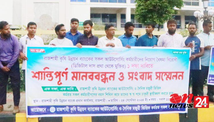 হয়েছে। পরে এ বিষয়ে দ্রæত প্রয়োজনীয় ব্যবস্থ গ্রহনের দাবিতে স্বারকলিপি প্রদান করা হয়। সংবাদ সম্মলনে দাবি করা হয়, রাকাব এ প্রায় ১১০০ জন আউটসোর্সিং ও দৈনিক মজুরী ভিত্তিক জনবল নিয়োজিত থেকে ন্যায় ও নিষ্ঠার সাথে দায়িত্ব পালন করে আসছেন। কিন্তু বিগত সরকার টেন্ডারের মাধ্যমে তাদের নিয়োগের বিধান রেখে “আউটসোর্সিং নীতিমালা-২০১৮” নামে একটি নীতিমালা প্রকাশ করে। দীর্ঘদিনের অভিজ্ঞতাসম্পন্ন হওয়ায় অফিসিয়াল কাজ-কর্মে তাদের ভূমিকা অপরিহার্য এবং তাদের মেধাকে কাজে লাগিয়ে ন্যায্য পারিশ্রমীক না দিয়ে তাদেরকে বঞ্চিত করা হয় যা চরমভারবে বৈষম্য বটে। এছাড়া ওই নীতিমালা উল্লেখ করা হয় যে, কোন প্রতিষ্ঠান প্রধান ইচ্ছা করলে অর্থমন্ত্রণালয়ের সম্মতিক্রমে সেবা সরবরাহকারী প্রতিষ্ঠান ব্যতীত সরাসরি সেবা প্রদানকারীর সাথেও চুক্তি করে আউটসোর্সিং কর্মচারী নিয়োগ দিতে পারবে। অন্ত্যন্ত পরিতাপের বিষয় বিগত সরকারের আমলে এ বিষয়ে কোন পদক্ষেপ গ্রহণ করে নাই। এমন বৈষম্যমূলক নীতিমালা থাকার কারণে তারা প্রতিনিয়ত বিভিন্ন সুযোগ-সুবিধা