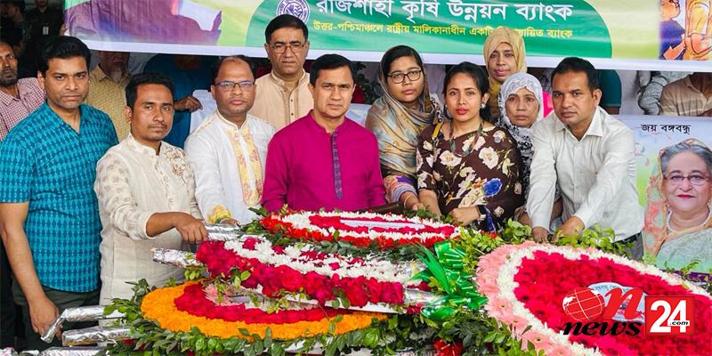 জাতির পিতা বঙ্গবন্ধু শেখ মুজিবুর রহমান- এর ১০৪ তম জন্মবার্ষিকী ও জাতীয় শিশু দিবস উদযাপন উপলক্ষ্যে রাজশাহী কৃষি উন্নয়ন ব্যাংক (রাকাব) এর পক্ষ থেকে প্রধান কার্যালয় চত্বরে অবস্থিত বঙ্গবন্ধুর ম্যূরালে পুস্পস্তবক অর্পণের মাধ্যমে শ্রদ্ধা নিবেদন করেন ব্যাংকের উপব্যবস্থাপনা পরিচালক আব্দুর রহিম।