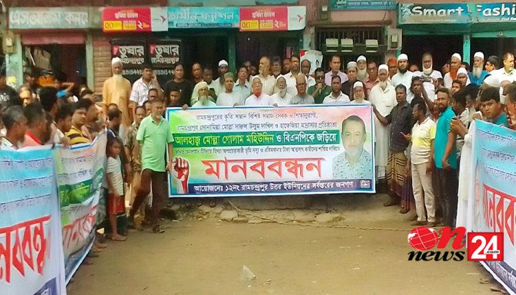 রামচন্দ্রপুরের সোনা মিয়া মোল্লা দারুল উলুম দাখিল ও হাফিজিয়া মাদ্রাসার প্রতিষ্ঠাতা, আলহাজ্ব মোল্লা গোলাম মহিউদ্দিন ও বি এনপিকে জড়িয়ে কথিত অনলাইন টিভিতে মিথ্যা অপপ্রচারকারী ভূমি দস্যু ও এতিমখানার টাকা আত্মসাৎ কারীদের শাস্তির দাবিতে বিক্ষোভ মিছিল ও মানববন্ধন করেছে এলাকাবাসী ।