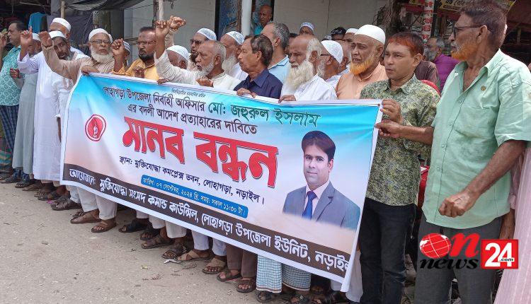 নড়াইলের লোহাগড়া উপজেলা নির্বাহী কর্মকর্তা (ইউএনও) মোঃ জহুরুল ইসলামের বদলির আদেশ প্রত্যাহারের দাবিতে লোহাগড়া উপজেলা মুক্তিযোদ্ধা সংসদের আয়োজনে মুক্তিযোদ্ধা কমপ্লেক্সের সামনে মানববন্ধন অনুষ্ঠিত হয়েছে।