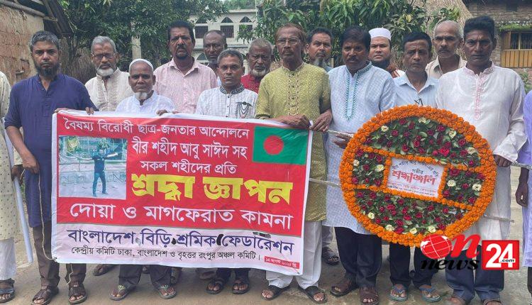 বৈষম্যবিরোধী ছাত্র আন্দোলনে পুলিশের গুলিতে নিহত রংপুর বেগম রোকেয়া বিশ্ববিদ্যালয়ের (বেরোবি) ইংরেজি বিভাগের শিক্ষার্থী শহীদ আবু সাঈদের কবর জিয়ারত করেছেন বাংলাদেশ বিড়ি শ্রমিক ফেডারেশন। বুধবার (১৪ আগস্ট) সকাল ১০ টায় বাংলাদেশ বিড়ি শ্রমিক ফেডারেশনের নেতৃবৃন্দ শহীদ আবু সাঈদের কবরে ফুল দিয়ে শ্রদ্ধা নিবেদন করেন ।