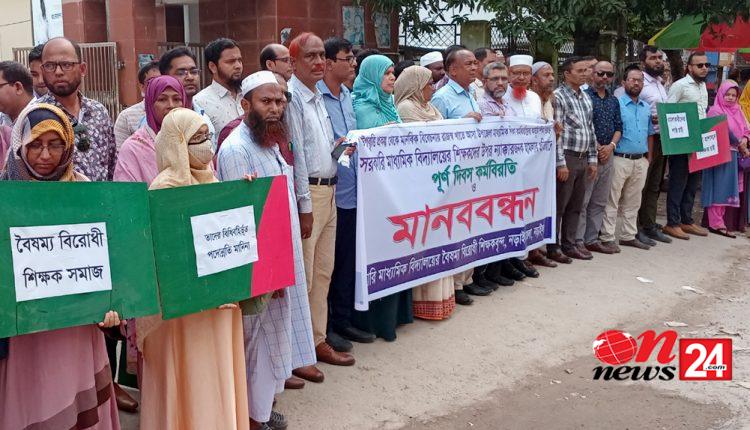 বুধবার (১৮ সেপ্টেম্বর) সরকারি মাধ্যমিক বিদ্যালয়ের বৈষম্য বিরোধী শিক্ষকবৃন্দ নড়াইল জেলা শাখার আয়োজনে সকাল থেকে নড়াইল সরকারি বালিকা উচ্চ বিদ্যালয় ও নড়াইল সরকারী বালক উচ্চ বিদ্যালয়ের শিক্ষকবৃন্দ ক্লাস বন্ধ করে কর্মবিরতি পালন করেন। দুপুর ১২টায় নড়াইল জেলা প্রশাসকের কার্যালয়ের সামনের সড়কে মানববন্ধন