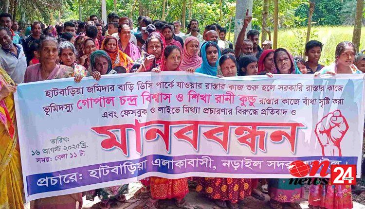 সরকারি রাস্তার কাজে ভূমিদস্যুদের বাধা সৃষ্টি ও ফেসবুকে অপপ্রচারের প্রতিবাদে নড়াইলে মানববন্ধন অনুষ্ঠিত