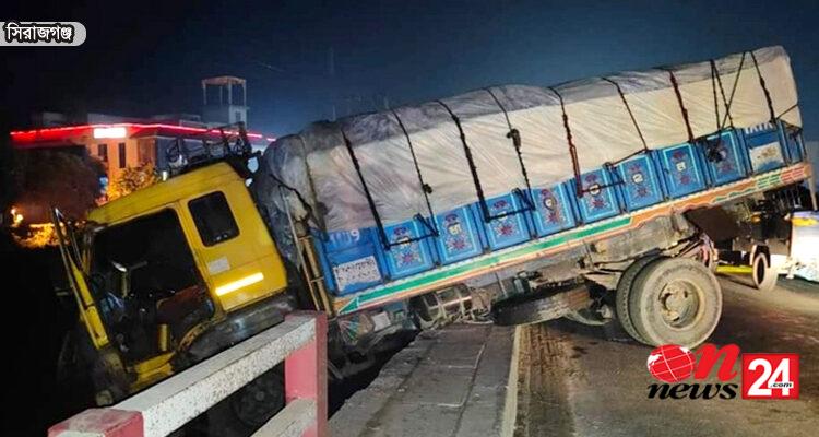সিরাজগঞ্জে ব্রিজের রেলিং ভেঙে ঝুলছিল ট্রাক