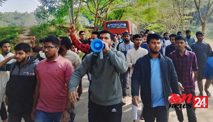 এসময় শিক্ষার্থীরা ‘আসাদ থেকে হাসিনা কোন স্বৈরাচার টিকেনা’ ‘নারায়ে তাকবীর আল্লাহু আকবার, ‘কাবুল থেকে দামেস্ক, ঢাকা থেকে দিল্লি সারা বিশ্বের মুসলিম এক হও এক হও’ হাসিনা গেছে যেই পথে বাশার গেছে সেই পথে’ বলে স্লোগান দেয়’।