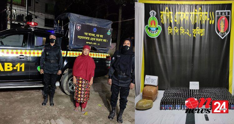 র্যাব-১১ এর সিপিসি-২ কর্তৃক কুমিল্লার সদর দক্ষিণ থানাধীন সোনাইছড়ি শাহাপুর এলাকা থেকে ৫৪৭ বোতল ফেন্সিডিল ও ০৬ কেজি গাঁজাসহ একজন মহিলা মাদক ব্যবসায়ী গ্রেফতার।