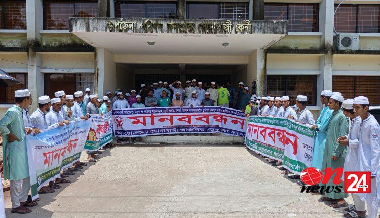 সোনাগাজীতে আঞ্চলিক সড়ক রক্ষা ও বালির ট্রাক চলাচল বন্ধের দাবিতে মানববন্ধন