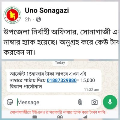 তারা বিভিন্ন লোকদের কাছে হোয়াইটসপে মেসেজ দিয়ে বিকাশ এই 01887329880 পারসোনাল নাম্বারটি পাঠিয়ে টাকা দাবি করছেন। এব্যাপারে ইউএনও সোনাগাজী ভেরিফাইড ফেসবুক আইডিতে কাউকে বিভ্রান্ত না হওয়ার জন্য এবং টাকা না দেওয়ার জন্য স্ট্যাটাস দেওয়া হয়েছে