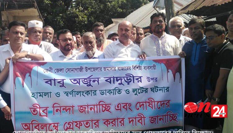 ফেনীর সোনাগাজীতে দিনে দুপুরে দোকানিকে কুপিয়ে স্বর্ন দোকানে ডাকাতির ঘটনার দুই দিনেও মামলা হয়নি। আহত দোকানি অর্জুন ভাদুরীর মাথায় রোববার রাতে সফল অস্ত্রপচার করা হয়েছে। তিনি চট্রগ্রাম ইম্প্রিরিয়াল এপোলো হাসপাতালে আইসিইউতে চিকিৎসাধীন রয়েছেন। পুলিশ জিজ্ঞাসাবাদের জন্য বেলাল হোসেন সৌরভ, সিরাজুল ইসলাম ও মো. মোস্তফা নামে তিনজনকে আটক করেছে। ঘটনাস্থলে গিয়ে র্যাব, পুলিশ, পিবিআই, সিআইডি ও ডিবি পুলিশ সহ একাধিক গোয়েন্দা সংস্থার লোকজন ক্রাইম সিন সংগ্রহ করেছেন। আইন শৃঙ্খলাবাহিনীর একাধিক সংস্থা ঘটনাটি ছায়া তদন্ত করেছেন বলে একটি নির্ভরযোগ্য সূত্র জানিয়েছেন। সোমবার সকালে সোনাগাজী উপজেলা আ.লীগের সভাপতি অধ্যাপক মফিজুল হক, সাধারণ সম্পাদক, পৌর মেয়র অ্যাড. রফিকুল ইসলাম খোকন, ফেনী জেলা জুয়েলারী সমিতির সভাপতি ইসমাইল হোসেন খোকন, সাধারণ সম্পাদক গোলাম ফারুক বাচ্চু, সোনাগাজী উপজেলা জুয়েলারী সমিতির সভাপতি বেলায়েত হোসেন, সাধারণ সম্পাদক নাসির উদ্দিন, চরদরবেশ ইউনিয়ন আ.লীগের সভাপতি মাস্টার সাহাব উদ্দিনের নেতৃত্বে ব্যবসায়ীরা জমাদার বাজারে বিক্ষোভ মিছিল শেষে ঘটনায় জড়িতদের দ্রুত গ্রেফতার করে শাস্তির আওতায় আনার দাবি জানান।
