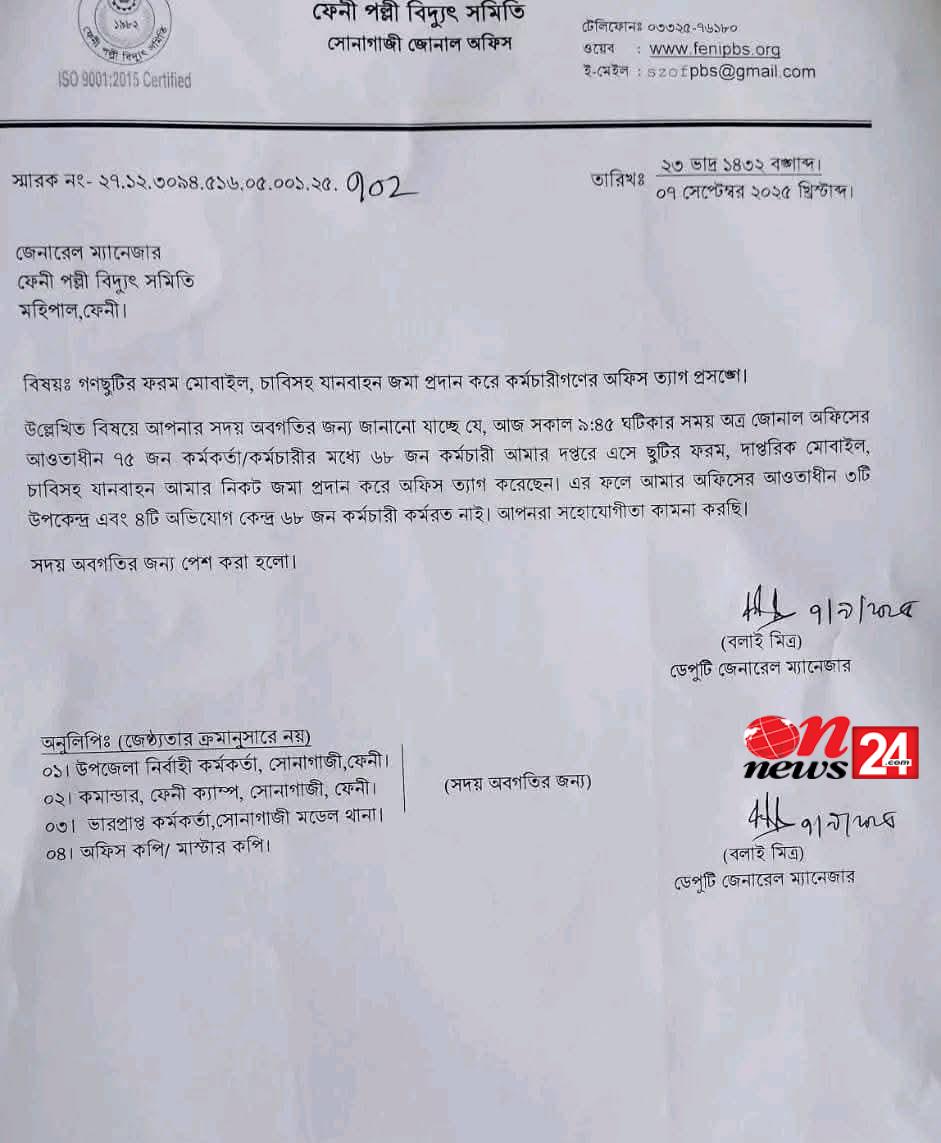 সোনাগাজীতে পল্লী বিদ্যুতের ৭৫ কর্মকর্তা কর্মচারীর মধ্যে ৬৫জন গণছুটি, সরকারের আল্টিমেটামে তিনজনের কর্মস্থলে যোগদান