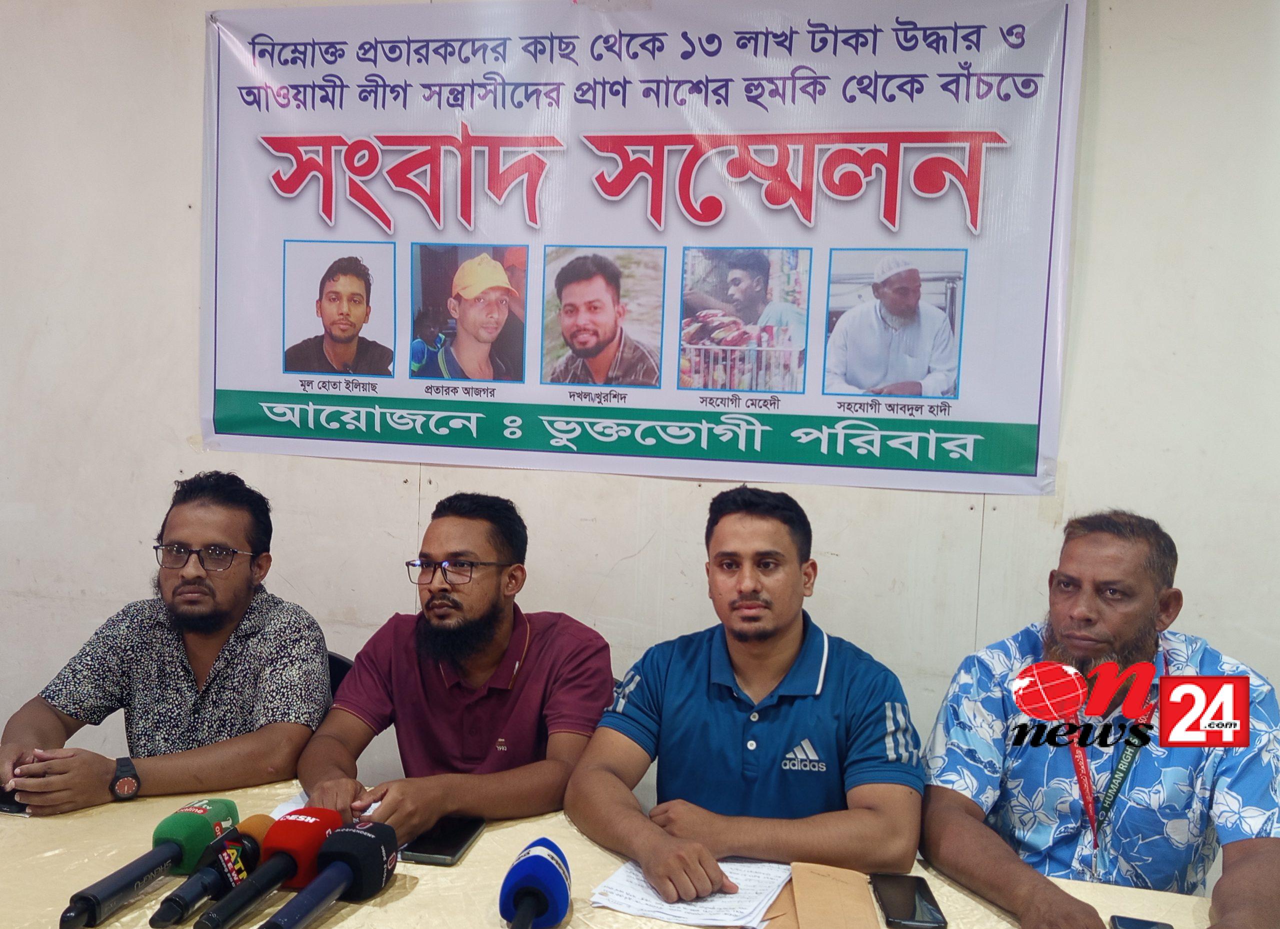 ফেনীর সোনাগাজীতে পাওনা ১৩ লাখ টাকা ফেরৎ পেতে ও আ.লীগ নেতাদের অব্যাহত প্রাণ নাশের হুমকি থেকে জীবন বাঁচাতে সংবাদ সম্মেলন করেছেন একটি ভুক্তভোগী পরিবার। মঙ্গলবার দুপুরে সোনাগাজী পৌর শহরের হারবি কাবাব রেস্টুরেন্টের কনভেনশন হলে তারা এ সংবাদ সম্মেলন করেন। ওই প্রতরাকদের খপ্পরে পড়ে ১৩ লাখ টাকা হারিয়ে পরিবারটি নিঃস্বহ হয়ে মানবেতর জীবন যাপন করছেন। ইউএনও অফিস, বণিক সমিতি, থানা, র্যাব ও সেনা ক্যাম্পেও লিখিত অভিযোগ দিয়েছেন তারা। নিরুপায় হয়ে সংবাদ সম্মেলনে তারা অভিযোগ করেন, পৌর শহরের ৪নং ওয়ার্ডের পাণ্ডব বাড়ির আবদুল হাদীর ছেলে সাবেক ছাত্রলীগ কর্মী মো. ইলিয়াছ প্রতারণার আশ্রয় নিয়ে আমিরাবাদ ইউনিয়নের চরডুব্বা গ্রামের নুর হোসইন থেকে ১৩ লাখ টাকা হাতিয়ে নেন। তার বিনিময়ে পৌর শহরের জিরোপয়েন্টে তার ভাড়াকৃত দোকান ঘরটি নুর হোসাইন কে বুঝিয়ে দেন। তিনি আসসুন্নাহ নামে ফার্মেসি চালু করেন। তার বিনিময়ে ব্যবসার লভ্যংশ থেকে ৮ শতাংশ এবং মাসিক ২০ হাজার টাকা ভাড়া পাবেন ইলিয়াছ। কিন্তু কয়েক মাস যাওয়ার পর ইলিয়াছ নুর হোসাইনকে দোকান থেকে বের করে দিয়ে তার ভাই তথ্য প্রযুক্তি লীগের সোনাগাজী উপজেলা সভাপতি আজগর হোসেন ও অপর ভাই খুরশিদ আলমকে বুঝিয়ে দেন। তারা নিউ মিনা বাজার নামে দোকান চালু করেন। এনিয়ে প্রতিকার চেয়ে নুর হোসাইন উপজেলা নির্বাহী কর্মকর্তার কাছে লিখিত অভিযোগ দেন। তিনি বিষয়টি নিয়ে দু'পক্ষের শুনানি দিলে একদিন উপস্থিত হলেও দ্বিতীয় দিন ইউএনও'র কার্যালয়ে হাজীর হননি ইলিয়াছ। পরবর্তীতে তিনি বিষয়টির আইনগত ব্যবস্থা নিতে ভুক্তভোগীকে থানায় পাঠান। থানায় বিষয়টি নিয়ে একাধিক সমঝোতা বৈঠক বসলেও ইলিয়াছ হাজীর না হয়ে উল্টো থানার ওসির বিরুদ্ধে সোমবার ফেনী প্রেসক্লাবে সংবাদ সম্মেলন করেন। এ দিকে ভুক্তভোগী পরববারকে টাকা ফেরৎ না দিয়ে আব্যাহত প্রাণ নাশের হুমকি দিতে থাকে। তাই ভুক্তভোগী পরিবারটি টাকা উদ্ধার ও জীবন বাঁচাতে সংবাদ সম্মেলন করেন। সংবাদ সম্মেলনে বক্তব্য রাখেন ভুক্তভোগী নুর হোসাইন, শ্যালক শাখাওয়াত হোসেন রায়হান, টাকা লেনদেনের মধ্যস্থতাকারী আশরাফুল ইসলাম বুলবুল ও তার ফুফা ডা. ইমাম উদ্দিন।