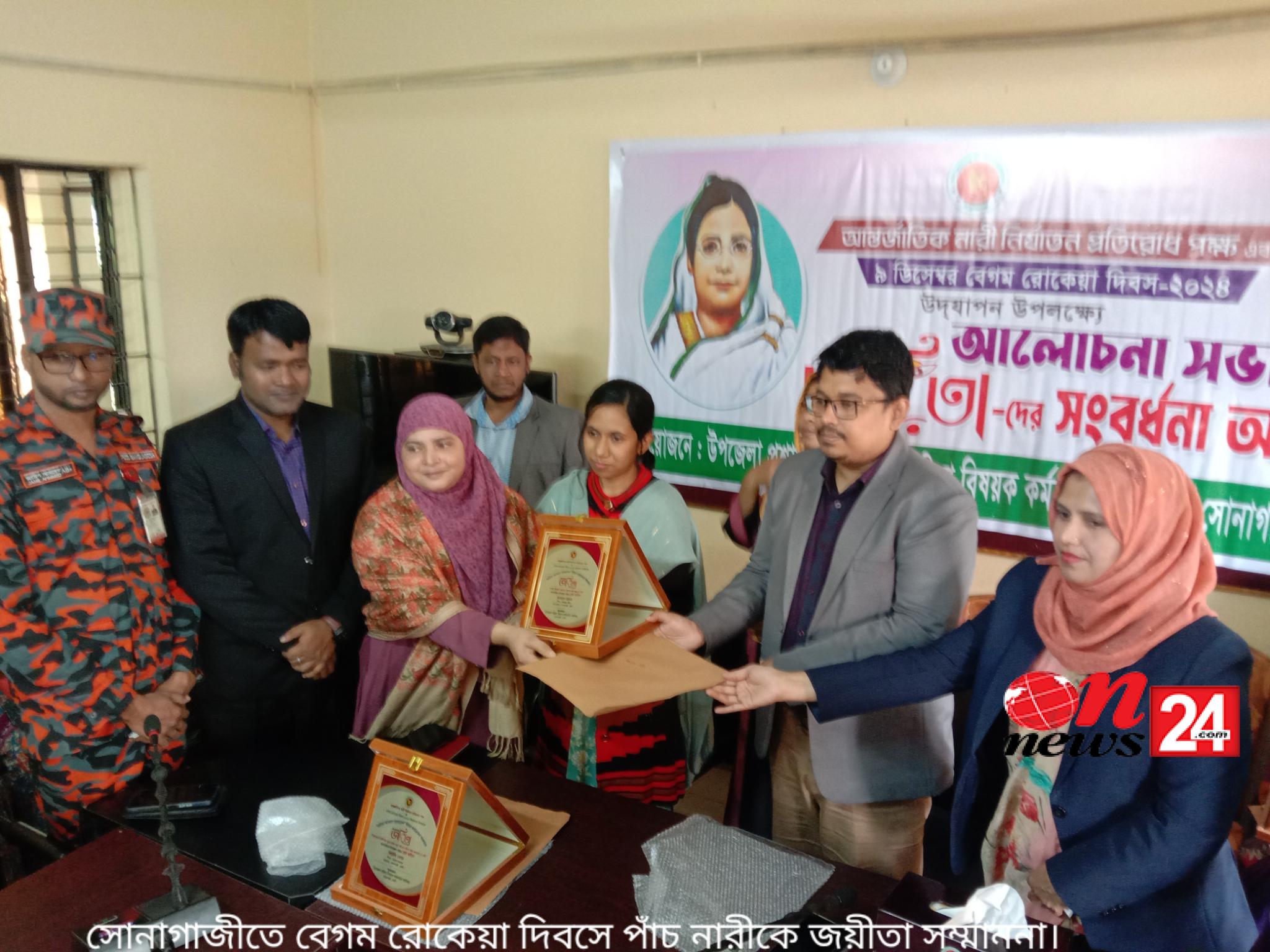 আন্তর্জাতিক নারী নির্যাতন প্রতিরোধ পক্ষ ও বেগম রোকেয়া দিবসে "নারী-কন্যার সুরক্ষা করি, সহিংসতামুক্ত বিশ্ব গড়ি" প্রতিপাদ্য নিয়ে ফেনীর সোনাগাজীতে মহিলা অধিদফতরের উদ্যোগে পাঁচ নারীকে জয়ীতা সম্মাননা দেয়া হয়েছে। উপজেলা মহিলা অধিদফতরের কর্মকর্তা নার্গিস আক্তারের সভাপতিত্বে ও স্কাউটস লিডার বেল্লাল উদ্দিনের সঞ্চালনায় সোমবার সকালে উপজেলা পরিষদ মিলনায়তনে অনুষ্ঠিত আলোচনা সভায় প্রধান অতিথি ছিলেন উপজেলা নির্বাহী কর্মকর্তা কামরুল হাসান। বিশেষ অতিথি ছিলেন উপজেলা সহকারি কমিশনার (ভূমি) তানিয়া আক্তার লুবনা, উপজেলা কৃষি সম্প্রসারণ কর্মকর্তা আল-আমিন শেখ ও উপজেলা মাধ্যমিক শিক্ষা কর্মকর্তা মো. নুরুল আমিন।