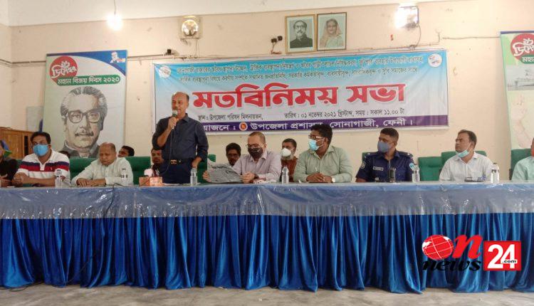 উপজেলা নির্বাহী কর্মকর্তা এএম জহিরুল হায়াতের সভাপতিত্বে ও পৌর কাউন্সিলর জামাল উদ্দিন নয়নের সঞ্চালনায় অনুষ্ঠিত মতবিনিময় সভায় প্রধান অতিথি ছিলেন উপজেলা পরিষদের চেয়ারম্যান জহির উদ্দিন মাহমুদ লিপটন। বিশেষ অতিথি ছিলেন পৌর মেয়র, উপজেলা আ.লীগের সাধারণ সম্পাদক অ্যাডভোকেট রফিকুল ইসলাম খোকন, সহকারি কমিশনার (ভূমি) লিখন বনিক, সোনাগাজী মডেল থানার ওসি সাজেদুল ইসলাম, উপজেলা ভাইস চেয়ারম্যান সাখাওয়াতুল হক বিটু, সাবেক উপজেলা মুক্তিযোদ্ধা কমান্ডার সৈয়দ নাছির উদ্দিন, পৌর আ.লীগের সাধারণ সম্পাদক আবু তৈয়ব বাবুল, সোনাগাজী বাজার বণিক সমিতির সভাপতি নূরনবী বিএসসি, যুগ্ম-সাধারণ সম্পাদক সাখাওয়াত হোসেন রানা। অন্যান্যের মাঝে বক্তব্য রাখেন সাংবাদিক জাবেদ হোসাইন মামুন, শেখ আবদুল হান্নান, আমজাদ হোসেন, ব্যবসায়ী সাইফুল ইসলাম বিপ্লব, বেলায়েত হোসেন, আবদুল আজিজ, উপজেলা পূজা উদযাপন পরিষদের সভাপতি সমর দাস ও মো. আজাদ প্রমুখ।