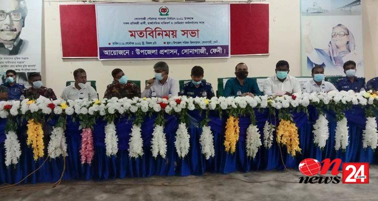 উপজেলা নির্বাহী কর্মকর্তা ও রিটার্নিং কর্মকর্তা এএম জহিরুল হায়াতের সভাপতি ও স্কাউট লিডার বেলাল হোসেনের সঞ্চালনায় অনুষ্ঠিত মতবিনিময় সভাপতি প্রধান অতিথি ছিলেন ফেনী জেলা প্রশাসক আবু সেলিম মাহমুদ উল হাসান। বিশেষ অতিথি ছিলেন ফেনী পুলিশ সুপার খোন্দকার নূরুন্নবী, বিজিবি’র ১৯ ব্যাটালিয়ন কমান্ডিং অফিসার আবদুর রহিম ও জেলা নির্বাচন কর্মকর্তা নাছির উদ্দিন পাটোয়ারী। আরো বক্তব্য রাখেন সোনাগাজী উপজেলা পরিষদের চেয়ারম্যান জহির উদ্দিন মাহমুদ লিপটন, ভাইস চেয়ারম্যান সাখাওয়াতুল হক বিটু, জোবেদা নাহার মিলি, সহকারি কমিশনার (ভূমি) লিখন বনিক, উপজেলা আ.লীগের সভাপতি অধ্যাপক মফিজুল হক, সোনাগাজী মডেল থানার ওসি সাজেদুল ইসলাম, উপজেলা নির্বাচন কর্মকর্তা মাইনুল হক, মেয়র প্রার্থী অ্যাডভেকেট রফিকুল ইমলাম খোকন, আবু নাছের, মাও. হাফেজ হিজবুল্লাহ, কাউন্সিলর প্রার্থী ইমাম উদ্দিন ভূঞা, বেলাল হোসেন, শেখ কলিম উল্যাহ রয়েল, জাবের হোসেন, সাংবাদিক আমজাদ হোসাইন ও উপজেলা জাতীয় পার্টির সভাপতি হাজী আবু সুফিয়ান প্রমুখ।