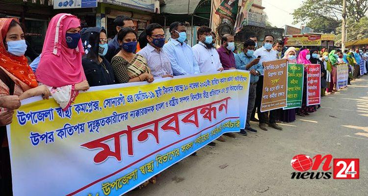 সোনারগাঁয়ে টিকা কেন্দ্রে হামলার প্রতিবাদে মানববন্ধন