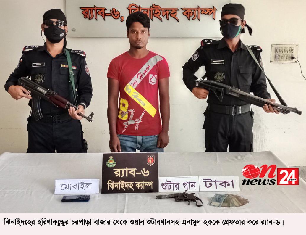 ঝিনাইদহের হরিনাকুেন্ডু অস্ত্রসহ এনামুল হক (২২) নামে এক মাদক ব্যবসায়ীকে গ্রেফতার করেছে র্যাব-৬। বৃহস্পতিবার বিকালে চরপাড়া বাজার থেকে গ্রেফতার করে র্যাব। এসময় এনামুলের নিকট থেকে একটি ওয়ান শুটারগান উদ্ধার করা হয়। গ্রেফতাকৃত এনামুল উপজেলার রঘুনাথপুর ইউনিয়নের আড়–য়াকান্দি গ্রামের মোয়াজ্জেম হোসেনের ছেলে। বৃহস্পতিবার রাতে র্যাব-৬ এক মেইল বার্তায় এসব তথ্য জানায়।