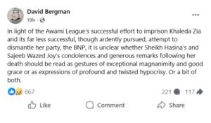 সেই হাসিনা গতকাল খালেদা জিয়ার মৃত্যুতে শোকবার্তা জানিয়েছেন। শুধু তিনি একাই নন, তার ছেলে সজীব ওয়াজেদ জয়ও শোকবার্তা জানিয়েছেন বিএনপি চেয়ারপার্সনের মৃত্যুতে। তবে এসব কথা ‘ভণ্ডামির বহিঃপ্রকাশ’ কি না, তা নিয়ে সন্দেহ প্রকাশ করেছেন ডেভিড বার্গম্যান। সম্প্রতি সামাজিক যোগাযোম মাধ্যম ফেইসবুকে এক পোস্টের মাধ্যমে এই কথা জানান তিনি।