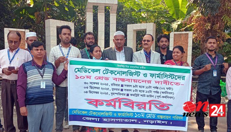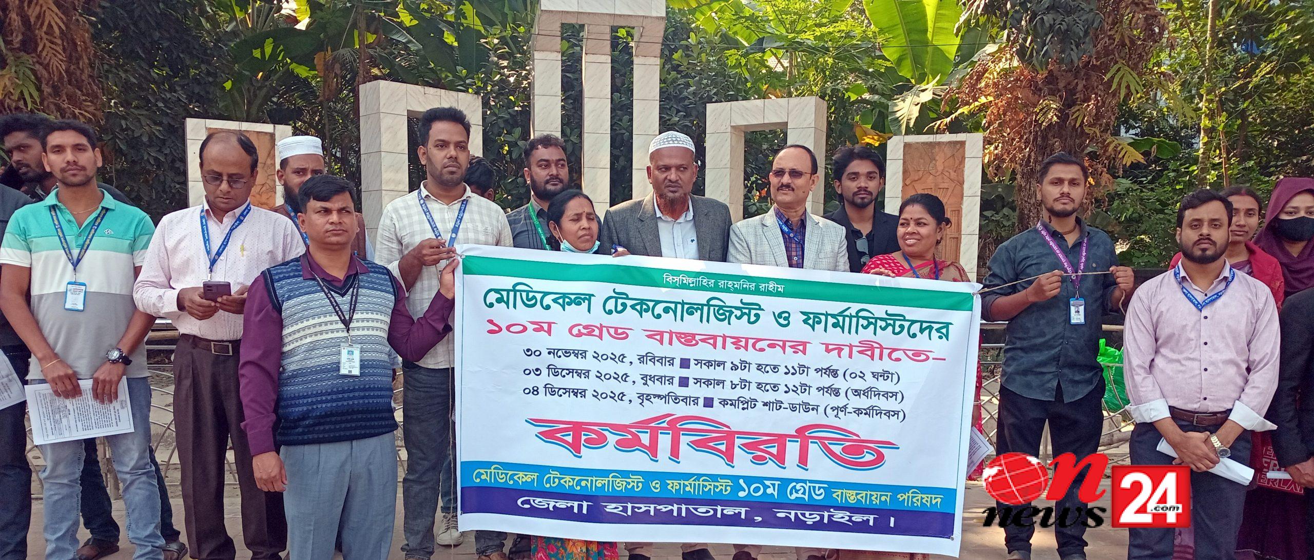 ১০ম গ্রেড বাস্তবায়নের দাবিতে নড়াইলে মেডিকেল টেকনোলজিস্ট ও ফার্মাসিস্টদের কর্মবিরতি পালন