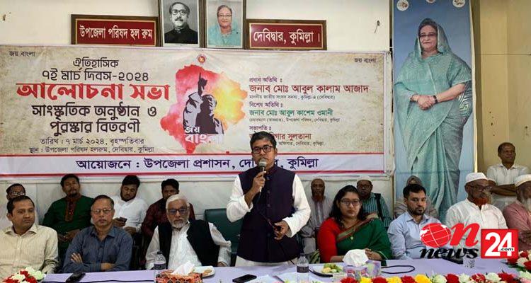 কুমিল্লার দেবিদ্বারে ঐতিহাসিক ৭ই মার্চ দিবস উপলক্ষ্যে উপজেলা প্রশাসন আয়োজিত আলোচনা সভায় প্রধান অতিথির বক্তব্যে কুমিল্লা-৪ (দেবিদ্বার) আসনের সংসদ সদস্য মো. আবুল কালাম আজাদ বলেছেন, জাতির পিতার ঐতিহাসিক ৭ই মাচের্র ভাষণ স্বাধীনতাকামী বাঙ্গালীকে ৭১ এ দিয়েছে দিকনির্দেশনা, আর এখন ভবিষ্যৎ প্রজন্মকে ন্যায় ও মুক্তির পথে উজ্জ্বীবিত করছে। এই ভাষণ প্রজন্ম থেকে প্রজন্মান্তরে বিশ্বের মুক্তিকামী মানুষকে প্রেরণা জোগাবে। ইউনেস্কো কর্তৃক এ ভাষণের স্বীকৃতি পৃথিবীর মানুষকে বঙ্গবন্ধুর অবিসংবাদিত নেতৃত্ব ও আমাদের মুক্তিসংগ্রাম সমন্ধে জানার সুযোগ করে দিয়েছে।